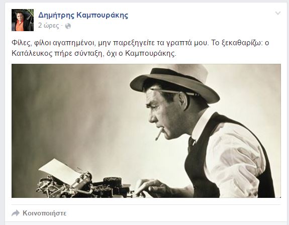 «Φίλες, φίλοι αγαπημένοι, μην παρεξηγείτε τα γραπτά μου. Το ξεκαθαρίζω: ο Κατάλευκος πήρε σύνταξη, όχι ο Καμπουράκης», έγραψε στον προσωπικό του λογαριασμό στο Facebook, ο δημοσιογράφος Δημήτρης Καμπουράκης.
