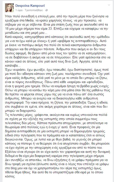 Η Δέσποινα Καμπούρη έγραψε στο facebook για την αποχώρηση της Έλενας Παπαβασιλείου και της Σοφίας Βογιατζάκη από την εκπομπή “Γυναίκες”.