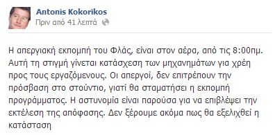 Αυτή τη στιγμή γίνεται κατάσχεση στον ραδιοφωνικό σταθμό Flash. Ο Αντώνης Κοκορίκος το ανακοίνωσε με μια ανάρτηση στην προσωπική του σελίδα στο Facebook.