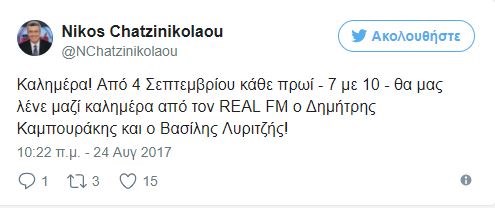 Την ανακοίνωση έκανε μέσω Twitter ο Νίκος Χατζηνικολάου.