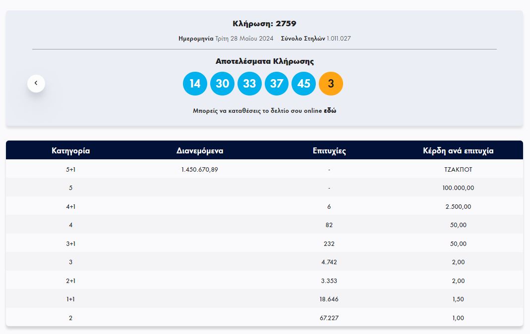 Στην κλήρωση ΤΖΟΚΕΡ, την Τρίτη 28/5/2024 (αριθμός κλήρωσης 2759), οι τυχεροί αριθμοί ήταν οι εξής: