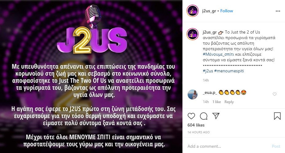 «Η αγάπη σας έφερε το J2US πρώτο στη ζώνη μετάδοσής του. Σας ευχαριστούμε για την τόσο θερμή υποδοχή και ευχόμαστε να είμαστε πολύ σύντομα ξανά κοντά σας. Μέχρι τότε όλοι ΜΕΝΟΥΜΕ ΣΠΙΤΙ, είναι σημαντικό να προστατέψουμε τους γύρω μας και την οικογένειά μας», τονίζει η ανακοίνωση.