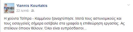 «Η χούντα Τσίπρα – Καμμένου ξαναχτύπησε. Μετά τους αστυνομικούς και τους εισαγγελείς, σήμερα εισέβαλε στα γραφεία η επιθεώρηση εργασίας. Ας στείλουν όποιον θέλουν. Όλοι είναι ευπρόσδεκτοι», αναφέρει στην ανάρτησή του στο Facebook, ο εκδότης της εφημερίδας «Παραπολιτικά».