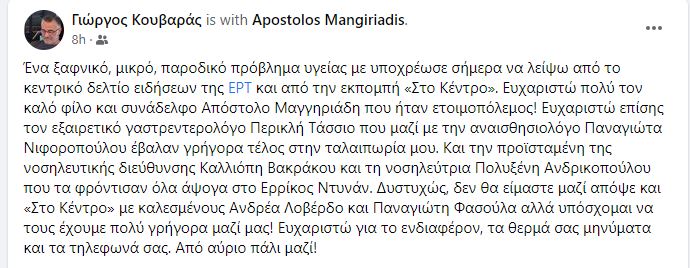 «Ένα ξαφνικό, μικρό, παροδικό πρόβλημα υγείας με υποχρέωσε σήμερα να λείψω από το κεντρικό δελτίο ειδήσεων της ΕΡΤ και από την εκπομπή «Στο Κέντρο». Ευχαριστώ πολύ τον καλό φίλο και συνάδελφο Απόστολο Μαγγηριάδη που ήταν ετοιμοπόλεμος! Ευχαριστώ επίσης τον εξαιρετικό γαστρεντερολόγο Περικλή Τάσσιο που μαζί με την αναισθησιολόγο Παναγιώτα Νιφοροπούλου έβαλαν γρήγορα τέλος στην ταλαιπωρία μου. Και την προϊσταμένη της νοσηλευτικής διεύθυνσης Καλλιόπη Βακράκου και τη νοσηλεύτρια Πολυξένη Ανδρικοπούλου που τα φρόντισαν όλα άψογα στο Ερρίκος Ντυνάν. Δυστυχώς, δεν θα είμαστε μαζί απόψε και «Στο Κέντρο» με καλεσμένους Ανδρέα Λοβέρδο και Παναγιώτη Φασούλα αλλά υπόσχομαι να τους έχουμε πολύ γρήγορα μαζί μας! Ευχαριστώ για το ενδιαφέρον, τα θερμά σας μηνύματα και τα τηλεφωνά σας. Από αύριο πάλι μαζί!» έγραψε ο δημοσιογράφος σε ανάρτησή του στο Facebook.