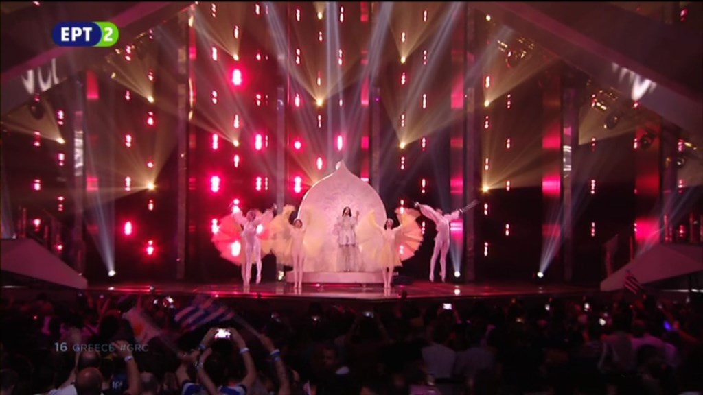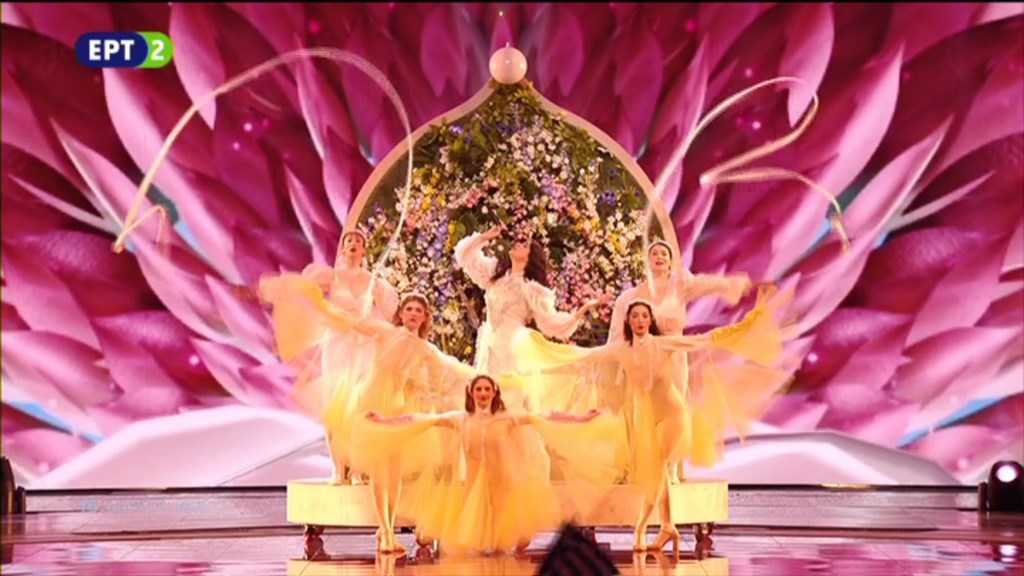 Τα χρώματα που επικράτησαν στο φόντο της ήταν το μωβ, το ροζ ενώ αντανακλούσε και το κίτρινο από τα φόρεμα που ήταν ντυμένες οι χορεύτριες της. Η παραμυθένια κατασκευή με λουλούδια ολοκλήρωσε την απίθανη εμφάνισή της στον πρώτο ημιτελικό.