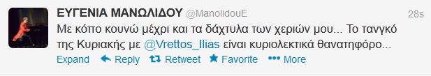 «Με κόπο κουνώ μέχρι και τα δάχτυλα των χεριών μου… Το τανγκό της Κυριακής με τον Ηλία Βρεττό είναι κυριολεκτικά θανατηφόρο…», έγραψε στο twitter η Ευγενία Μανωλίδου.