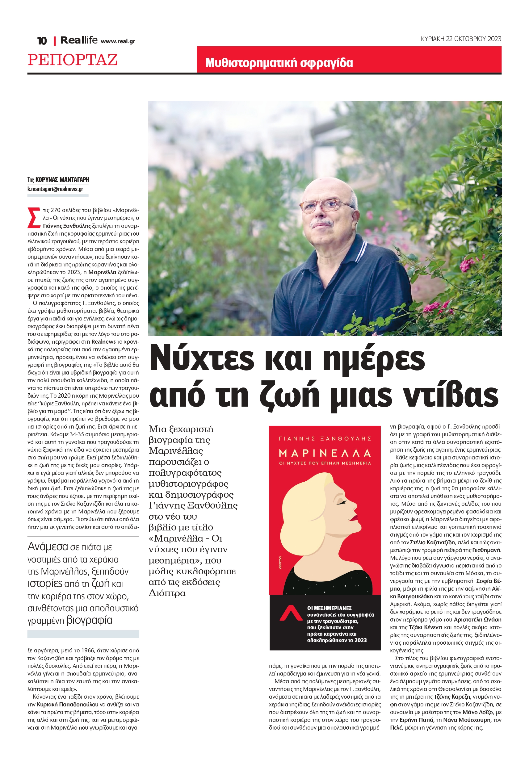Ο πολυγραφότατος Γ. Ξανθούλης, ο οποίος έχει γράψει μυθιστορήματα, βιβλία, θεατρικά έργα για παιδιά και για ενήλικες, ενώ ως δημοσιογράφος έχει διαπρέψει με τη δυνατή πένα του σε εφημερίδες και με τον λόγο του στο ραδιόφωνο, περιγράφει στη Realnews το χρονικό της πολιορκίας του από την αγαπημένη ερμηνεύτρια, προκειμένου να ενδώσει στη συγγραφή της βιογραφίας της: «Το βιβλίο αυτό θα έλεγα ότι είναι μια υβριδική βιογραφία για αυτή την πολύ σπουδαία καλλιτέχνιδα, η οποία πάντα το πίστευα ότι είναι υπεράνω των τραγουδιών της. Το 2020 η κόρη της Μαρινέλλας μου είπε ”κύριε Ξανθούλη, πρέπει να κάνετε ένα βιβλίο για τη μαμά”. Της είπα ότι δεν ξέρω τις βιογραφίες και ότι πρέπει να βρεθούμε να μου πει ιστορίες από τη ζωή της. Ετσι άρχισε η περιπέτεια. Κάναμε 34-35 συμπόσια μεσημεριανά και αυτή τη γυναίκα που τραγουδούσε τη νύχτα ξαφνικά την είδα να έρχεται μεσημέρια στο σπίτι μου να τρώμε. Εκεί μέσα ξεδιπλώθηκε η ζωή της με τις δικές μου απορίες. Υπάρχω κι εγώ μέσα γιατί αλλιώς δεν μπορούσα να γράψω, θυμάμαι παράλληλα γεγονότα από τη δική μου ζωή. Ετσι ξεδιπλώθηκε η ζωή της με τους άνδρες που έζησε, με την περίφημη σχέση της με τον Στέλιο Καζαντζίδη και όλα τα κατοπινά χρόνια με τη Μαρινέλλα που ξέρουμε όπως είναι σήμερα. Πιστεύω ότι πάνω από όλα ήταν μια εκ γενετής σολίστ και αυτό το απέδειξε αργότερα, μετά το 1966, όταν χώρισε από τον Καζαντζίδη και τράβηξε τον δρόμο της με πολλές δυσκολίες. Από εκεί και πέρα, η Μαρινέλλα γίνεται η σπουδαία ερμηνεύτρια, ανακαλύπτει η ίδια τον εαυτό της και την ανακαλύπτουμε και εμείς».
