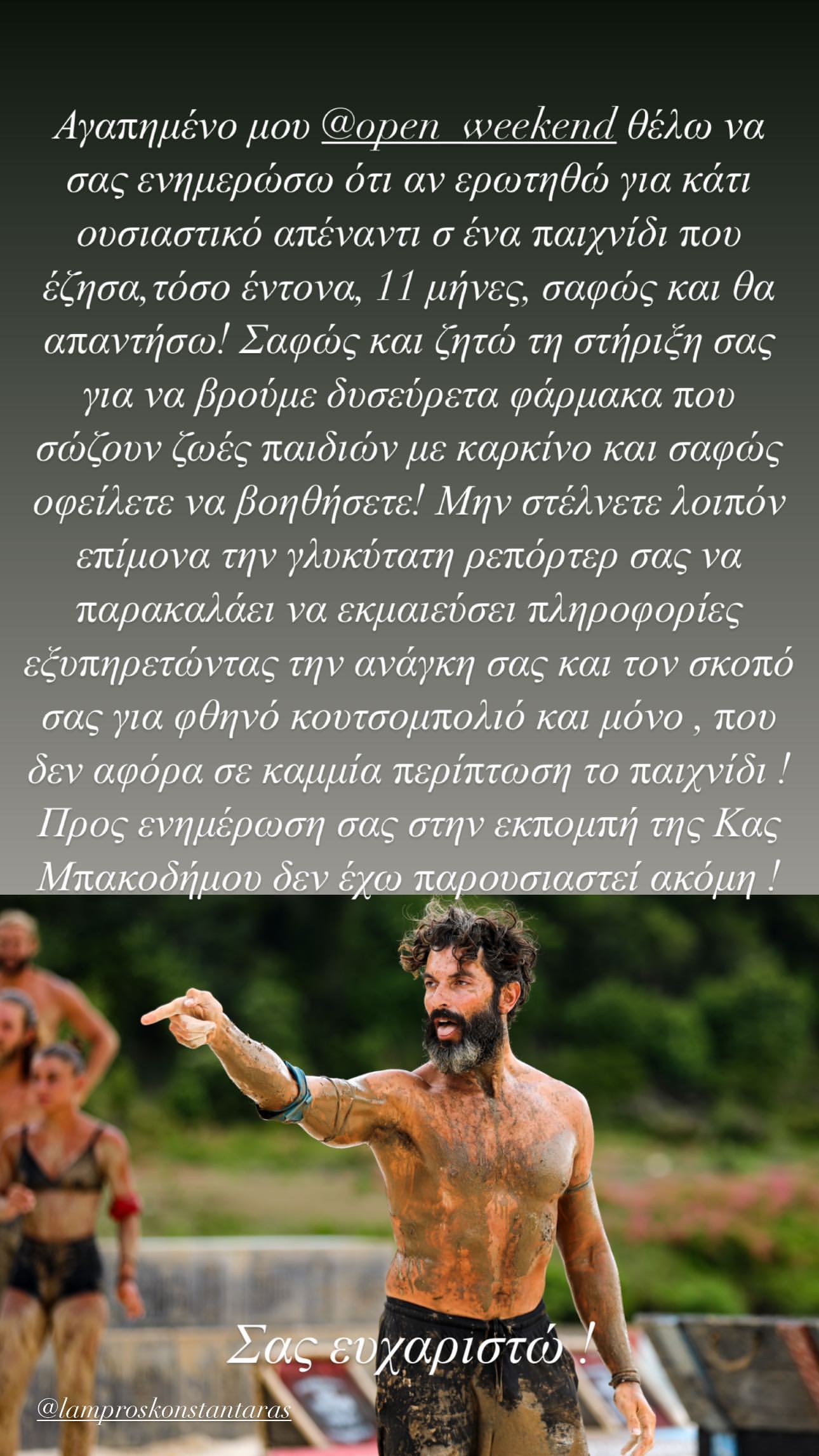 Ο Σπύρος Μαρτίκας απάντησε στα όσα ειπώθηκαν με ένα story του στο instagram, στο οποίο έγραψε: «Αγαπημένο μου Open Weekend θέλω να σας ενημερώσω ότι αν ερωτηθώ για κάτι ουσιαστικό απέναντι σε ένα παιχνίδι που έζησα τόσο έντονα, 11 μήνες, σαφώς και θα απαντήσω. Σαφώς και ζητώ τη στήριξή σας για να βρούμε δυσεύρετα φάρμακα που σώζουν ζωές παιδιών με καρκίνο και σαφώς οφείλετε να βοηθήσετε. Μην στέλνετε λοιπόν επίμονα τη γλυκύτατη ρεπόρτερ σας να παρακαλάει να εκμαιεύσει πληροφορίες, εξυπηρετώντας την ανάγκη σας και τον σκοπό σας για φτηνό κουτσομπολιό και μόνο, που δεν αφορά σε καμία περίπτωση το παιχνίδι. Προς ενημέρωσή σας, στην εκπομπή της κυρίας Μπακοδήμου δεν έχω παρουσιαστεί ακόμη. Σας ευχαριστώ».