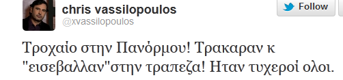 Σε τραπεζικό υποκατάσ��ημα “εισέβαλαν” δυο αυτοκίνητα που τράκαραν στην Πανόρμου. Αυτόπτης μάρτυρας και “φωτογράφος” ήταν ο παρουσιαστής της “ΜΗΧΑΝΗΣ ΤΟΥ ΧΡΟΝΟΥ” Χρ.Βασιλόπουλος. ΔΕΙΤΕ ΤΙ ΕΓΡΑΨΕ ΣΤΟ TWITTER