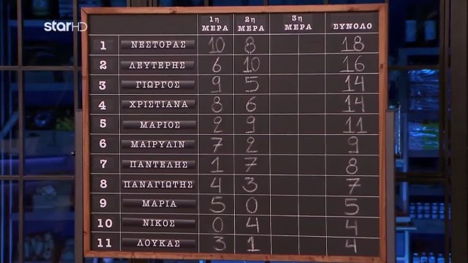 Η κατάταξη από τη δοκιμασία της Τρίτης έφερε τον Νίκο στη δυσχερέστερη θέση, καθώς είχε συγκεντρώσει τη χαμηλότερη βαθμολογία. Αντιθέτως, Νέστορας, Γιώργος, Μαίρυλιν και Χριστιάνα διατηρούσαν προβάδισμα έναντι των υπολοίπων.