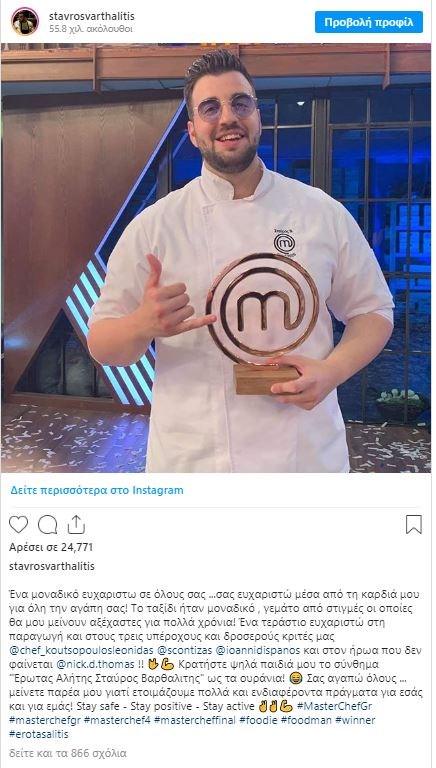 «Ένα μοναδικό ευχαριστώ σε όλους σας …σας ευχαριστώ μέσα από τη καρδιά μου για όλη την αγάπη σας! Το ταξίδι ήταν μοναδικό με τρομερές στιγμές , γεμάτο από στιγμές οι οποίες θα μου μείνουν αξέχαστες για πολλά χρόνια! Ένα τεράστιο ευχαριστώ στη παραγωγή και στους τρεις υπέροχους και δροσερούς κριτές μας @chef_koutsopoulosleonidas @scontizas @ioannidispanos και στον ήρωα που δεν φαίνεται @nick.d.thomas !! Κρατήστε ψηλά παιδιά μου το σύνθημα «Έρωτας Αλήτης Σταύρος Βαρθαλίτης» ως τα ουράνια! Σας αγαπώ όλους … μείνετε παρέα μου γιατί ετοιμάζουμε πολλά και ενδιαφέροντα πράγματα για εσάς και για εμάς! Stay safe – Stay positive – Stay active #MasterChefGr #masterchefgr #masterchef4 #mastercheffinal #foodie #foodman #winner #erotasalitis», έγραψε στην ανάρτησή του.
