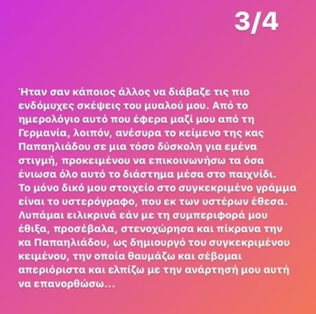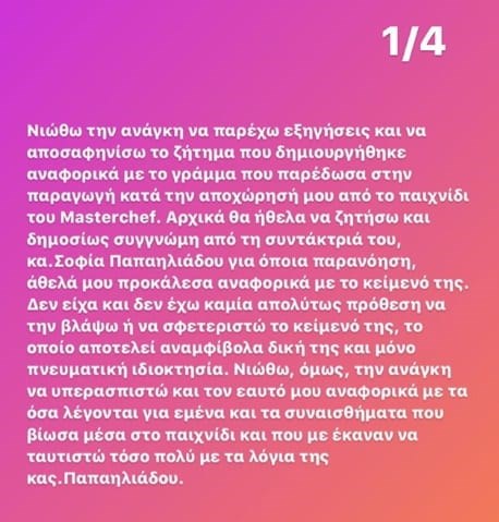 Όπως χαρακτηριστικά γράφει στον προσωπικό της λογαριασμό στο instagram η πρώην παίκτρια του ριάλιτι μαγειρικής, «νιώθω την ανάγκη να παρέχω εξηγήσεις και να αποσαφηνίσω το ζήτημα που δημιουργήθηκε αναφορικά με το γράμμα που παρέδωσα στην παραγωγή κατά την αποχώρησή μου από το παιχνίδι του Masterchef. Αρχικά θα ήθελα να ζητήσω και δημοσίως συγγνώμη από τη συντάκτριά του κα. Σοφία Παπαηλιάδου για όποια παρανόηση, άθελά μου προκάλεσα αναφορικά με το κείμενό της. Δεν είχα και δεν έχω καμία απολύτως πρόθεση να τη βλάψω ή να σφετεριστώ το κείμενό της, το οποίο αποτελεί αναμφίβολα δική της και μόνο πνευματική ιδιοκτησία. Νιώθω, όμως, την ανάγκη να υπερασπιστώ και τον εαυτό μου αναφορικά με τα όσα λέγονται για εμένα και τα συναισθήματά που βίωσα μέσα στο παιχνίδι και που με έκαναν να ταυτιστώ τόσο πολύ με τα λόγια της κας. Παπαηλιάδου.