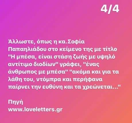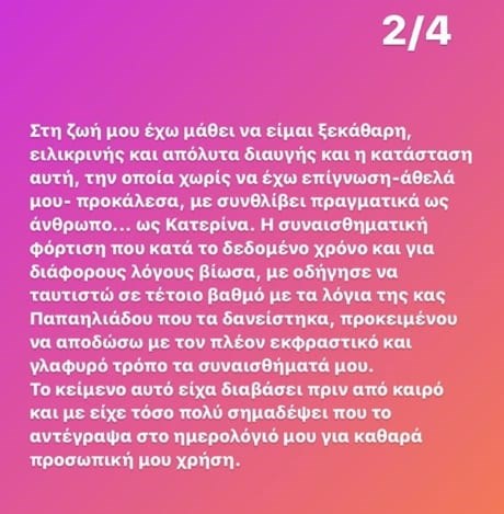 Στη ζωή μου έχω μάθει να είμαι ξεκάθαρη, ειλικρινής και απολύτως διαυγής και η κατάσταση αυτή, την οποία χωρίς να έχω επίγνωση -άθελά μου- προκάλεσα, με συνθλίβει πραγματικά ως άνθρωπο… ως Κατερίνα. Η συναισθηματική φόρτιση που κατά τον δεδομένο χρόνο και για διάφορους λόγους βίωσα, με οδήγησε να ταυτιστώ σε τέτοιο βαθμό με τα λόγια της κας Παπαηλιάδου που τα δανείστηκα, προκειμένου να αποδώσω με τον πλέον εκφραστικό και γλαφυρό τρόπο τα συναισθήματά μου.