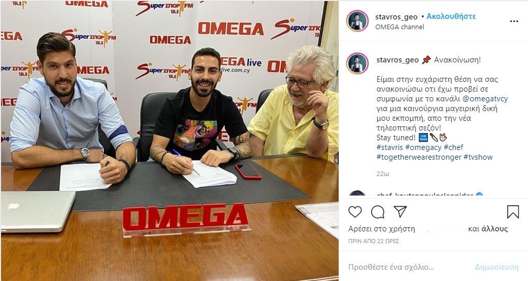 Με ανάρτησή του στον προσωπικό του λογαριασμό στο instagram ο Σταυρής Γεωργίου ανακοίνωσε ότι από τη νέα τηλεοπτική σεζόν θα παρουσιάζει τη δική του μαγειρική εκπομπή. Όπως επεσήμανε η εκπομπή θα προβάλλεται από το κανάλι Omega TV της Κύπρου. Ο φιναλίστ του MasterChef συνόδευσε την ανακοίνωσή του με στιγμιότυπο από τη στιγμή που υπογράφει το συμβόλαιο συνεργασίας με το κυπριακό κανάλι.