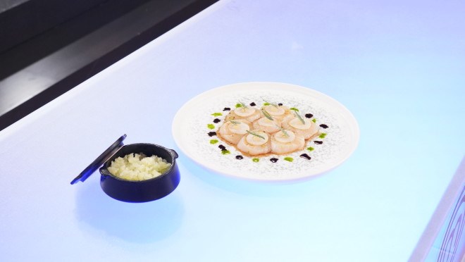 Ορεκτικό: Χτένια, συμπυκνωμένο αγγούρι και γρανίτα χαλεπένιοΤο πρώτο πιάτο αποτελεί ένα ορεκτικό με χτένια, σχεδόν σε μορφή σεβίτσε, μαριναρισμένα σε ιαπωνική σάλτσα wasabi. To γευστικό πιάτο είναι γαρνιρισμένο με τραγανό ραπανάκι, τζελ λεμονιού και λάδι από αφυδατωμένες ελιές και σχοινόπρασο. Το πιάτο συνοδεύεται με γρανίτα αγγουριού και πιπεριά jalapeno.