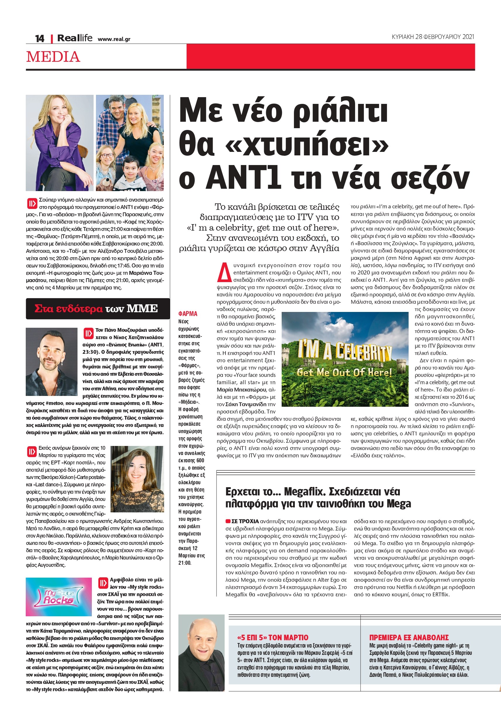 Σύμφωνα με πληροφορίες, ο ΑΝΤ1 είναι πολύ κοντά στην υπογραφή συμφωνίας με το ITV για την απόκτηση των δικαιωμάτων του ριάλιτι «I’m a celebrity, get me ouf of here». Πρόκειται για ριάλιτι επιβίωσης για διάσημους, οι οποίοι συνυπάρχουν σε περιβάλλον ζούγκλας για μερικούς μήνες και περνούν από πολλές και δύσκολες δοκιμασίες μέχρι ένας ή μία να κερδίσει τον τίτλο «Βασιλιάς» ή «Βασίλισσα της Ζούγκλας». Τα γυρίσματα, μάλιστα, γίνονται σε ειδικά διαμορφωμένες εγκαταστάσεις σε μακρινά μέρη (στη Νότια Αφρική και στην Αυστραλία), ωστόσο, λόγω πανδημίας, το ITV εισήγαγε από το 2020 μια ανανεωμένη εκδοχή του ριάλιτι που διεκδικεί ο ΑΝΤ1. Αντί για τη ζούγκλα, το ριάλιτι επιβίωσης για διάσημους δεν διαδραματίζεται πλέον σε εξωτικό προορισμό, αλλά σε ένα κάστρο στην Αγγλία. Μάλιστα, κάποια επεισόδια μεταδίδονται και live, με τις δοκιμασίες να έχουν ήδη μαγνητοσκοπηθεί, ενώ το κοινό έχει τη δυνατότητα να ψηφίσει. Οι διαπραγματεύσεις του ΑΝΤ1 με το ITV βρίσκονται στην τελική ευθεία. Δεν είναι η πρώτη φορά που το κανάλι του Αμαρουσίου «φλερτάρει» με το «I’m a celebrity, get me out of here». Το ίδιο ριάλιτι είχε εξεταστεί και το 2016 ως απάντηση στο «Survivor», αλλά τελικά δεν υλοποιήθηκε, καθώς κρίθηκε λίγος ο χρόνος για να γίνει σωστά η προετοιμασία του. Αν τελικά κλείσει το ριάλιτι επιβίωσης για celebrities, ο ΑΝΤ1 εμπλουτίζει τη φαρέτρα των ψυχαγωγικών του προγραμμάτων, καθώς έχει ήδη ανακοινώσει στο πεδίο των σόου ότι θα επαναφέρει το «Ελλάδα έχεις ταλέντο».