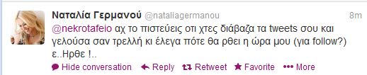 Μες την καλή χαρά είναι η Ναταλία Γερμανού παρά τις αλλαγές που έχουν γίνει τις τελευταίες ώρες στην εκπομπή της καθώς η παρουσιάστρια έγραψε στο twitter: “Αχ το πιστεύεις ότι χτες διάβαζα τα tweets σου και γελούσα σαν τρελλή…”