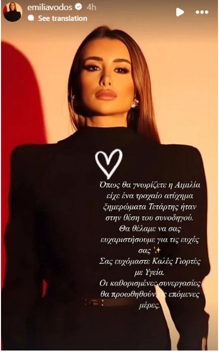 «Όπως θα γνωρίζετε, η Αιμιλία είχε ένα τροχαίο ατύχημα ξημερώματα Τετάρτης ήταν στη θέση του συνοδηγού. Θα θέλαμε να σας ευχαριστήσουμε για τις ευχές σας. Σας ευχόμαστε καλές γιορτές με υγεία. Οι καθορισμένες συνεργασίες θα προωθηθούν τις επόμενες ημέρες».