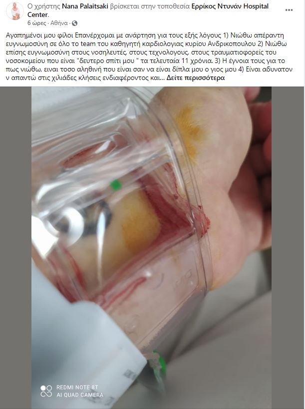 «Αγαπημένοι μου φίλοι επανέρχομαι με ανάρτηση για τους εξής λόγους 1) Νιώθω απέραντη ευγνωμοσύνη σε όλο το team του καθηγητή Καρδιολογίας κυρίου Ανδρικόπουλου 2) Νιώθω επίσης ευγνωμοσύνη στους νοσηλευτές, στους τεχνολόγους, στους τραυματιοφορείς του νοσοκομείου που είναι “δεύτερο σπίτι μου ” τα τελευταία 11 χρόνια. 3) Η έγνοια τους για το πώς νιώθω, είναι τόσο αληθινή που είναι σαν να είναι δίπλα μου ο γιος μου 4) Είναι αδύνατον να απαντώ στις χιλιάδες κλήσεις ενδιαφέροντος και στα μηνύματα που μου στέλνετε καθώς είμαι συνδεδεμένη με μηχανήματα. 5 ) Είμαι πολύ τυχερή που το Σάββατο ήρθα στο νοσοκομείο αμέσως μετά το περιστατικό 6 ) θα μείνω όσο οι θεράποντες κρίνουν 7) Η τεχνολογία που διαθέτει η μονάδα είναι τόσο άρτια που αντιμετωπίζονται τα πάντα 8 ) Όσοι έχουν υποστεί καρδιακά περιστατικά γνωρίζουν τις διαδικασίες 9 ) Αγνοώ μηνύματα “μίσους” καθώς επέλεγα τη φωτεινή πλευρά της ζωής και των ανθρώπων. Το γράφω για να μην στεναχωριούνται οι άνθρωποι που με αγαπούν, όπως είστε εσείς που με ακολουθείτε, με διαβάζετε, με κρίνετε 33 χρόνια. 10) Μου έχετε δώσει τεράστια χαρά εσείς οι συνεργάτες που με καλείτε ή που στέλνετε μηνύματα. Εσείς όλοι τεχνικοί, ηχολήπτες, μοντέρ, αρχισυντάκτες, διευθυντές μου, μουσικοί επιμελητές 11 ) Αυτό που θέλω πολύ είναι ένα Fredo Caputchino μέτριο… Τα φιλιά μου».