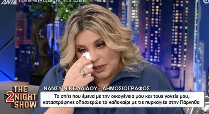 Καλεσμένη του Γρηγόρη Αρναούτογλου στο The 2night Show βρέθηκε το βράδυ της Δευτέρας η Νάνσυ Νικολαΐδου. Η δημοσιογράφος και τηλεκριτικός αναφέρθηκε στις στιγμές αγωνίας που έζησε το περασμένο καλοκαίρι από την πυρκαγιά στην Πάρνηθα, η οποία έκαψε ολοσχερώς το σπίτι της.