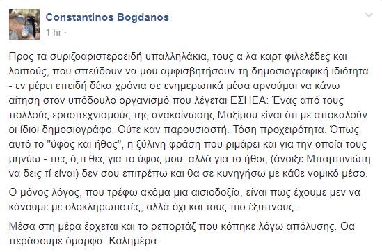 “Προς τα συριζοαριστεροειδή υπαλληλάκια, τους α λα καρτ φιλελέδες και λοιπούς, που σπεύδουν να μου αμφισβητήσουν τη δημοσιογραφική ιδιότητα – εν μέρει επειδή δέκα χρόνια σε ενημερωτικά μέσα αρνούμαι να κάνω αίτηση στον υπόδουλο οργανισμό που λέγεται ΕΣΗΕΑ: Ένας από τους πολλούς ερασιτεχνισμούς της ανακοίνωσης Μαξίμου είναι ότι με αποκαλούν οι ίδιοι δημοσιογράφο. Ούτε καν παρουσιαστή. Τόση προχειρότητα. Όπως αυτό το “ύφος και ήθος”, η ξύλινη φράση που ριμάρει και για την οποία τους μηνύω – πες ό,τι θες για το ύφος μου, αλλά για το ήθος (άνοιξε Μπαμπινιώτη να δεις τι είναι) δεν σου επιτρέπω και θα σε κυνηγήσω με κάθε νομικό μέσο” επισημαίνει ο Κωνσταντίνος Μπογδάνος και προσθέτει:
