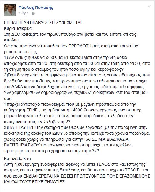 Με ανάρτησή του στο Facebook, ο αναπληρωτής υπουργός Υγείας, Παύλος Πολάκης, εξαπολύει νέα επίθεση προς τη δημοσιογράφο του Alpha, Ευαγγελία Τσικρίκα, με τίτλο «Επειδή η αντιπαράθεση συνεχίζεται…».