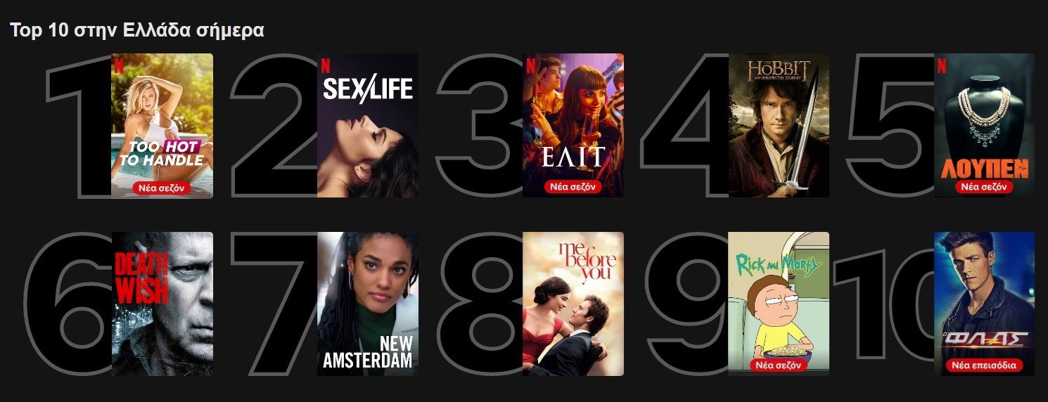 Στην κορυφή βρίσκεται το ριάλιτι “Too Hot to Handle”, ενώ στη 2η θέση είναι η σειρά φαινόμενο του Netflix, “Sex/Life“. Την πεντάδα συμπληρώνουν οι σειρές “Ελίτ” και “Λούπεν”, οι οποίες βρίσκονται στο Top10 εδώ και αρκετές εβδομάδες, και η ταινία “Χόμπιτ: Ένα Αναπάντεχο Ταξίδι”.