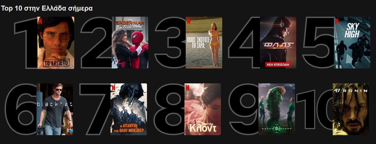 Η νέα δραματική αστυνομική σειρά “Το ερπετό”, κυκλοφόρησε και μέσα σε λίγες ημέρες, κατέκτησε την κορυφή. Έκπληξη στο No.2, στο οποίο βρίσκεται η ταινία της Marvel, “Spider-Man: Far From Home” του 2019. Η ισπανική σειρά “Ποιος σκότωσε τη Σάρα” εξακολουθεί να βρίσκεται ψηλά. Σταθερές αξίες όπως “Οι Άτακτοι της Οδού Μπέικερ”, το “Sky Rojo” και το “The Flash” βρίσκονται για ακόμη μία εβδομάδα στο Top10. Ακόμη μία έκπληξη αποτελεί η παρουσία της ταινίας “Green Laturn” στη δεκάδα.