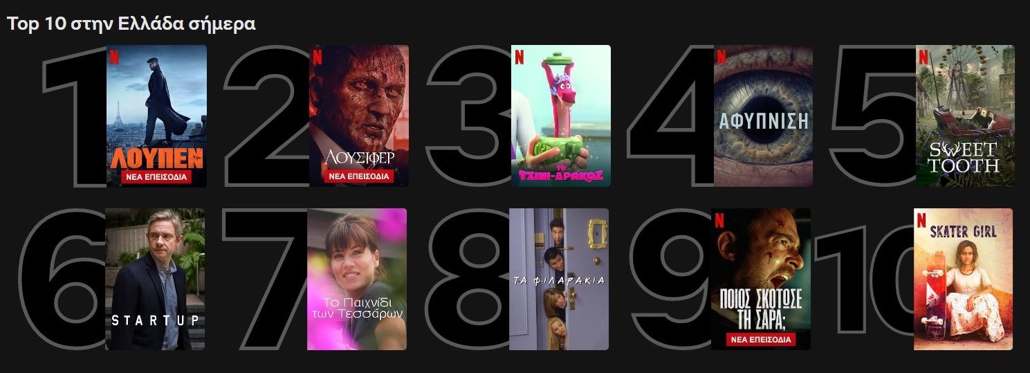 Στην 1η θέση βρίσκεται η αστυνομική τηλεοπτική σειρά, Λουπέν, με νέα επεισόδια. Ο Λούσιφερ “έπεσε” στη 2η θέση, με την τριάδα να κλείνει η ταινία κινουμένων σχεδίων, “Τζίνι-Δράκος”. Η εξαιρετική σειρά δράσης “Sweet Tooth” βρίσκεται στην 5η θέση, ενώ σταθερά στο Top 10 είναι “Τα Φιλαράκια”.