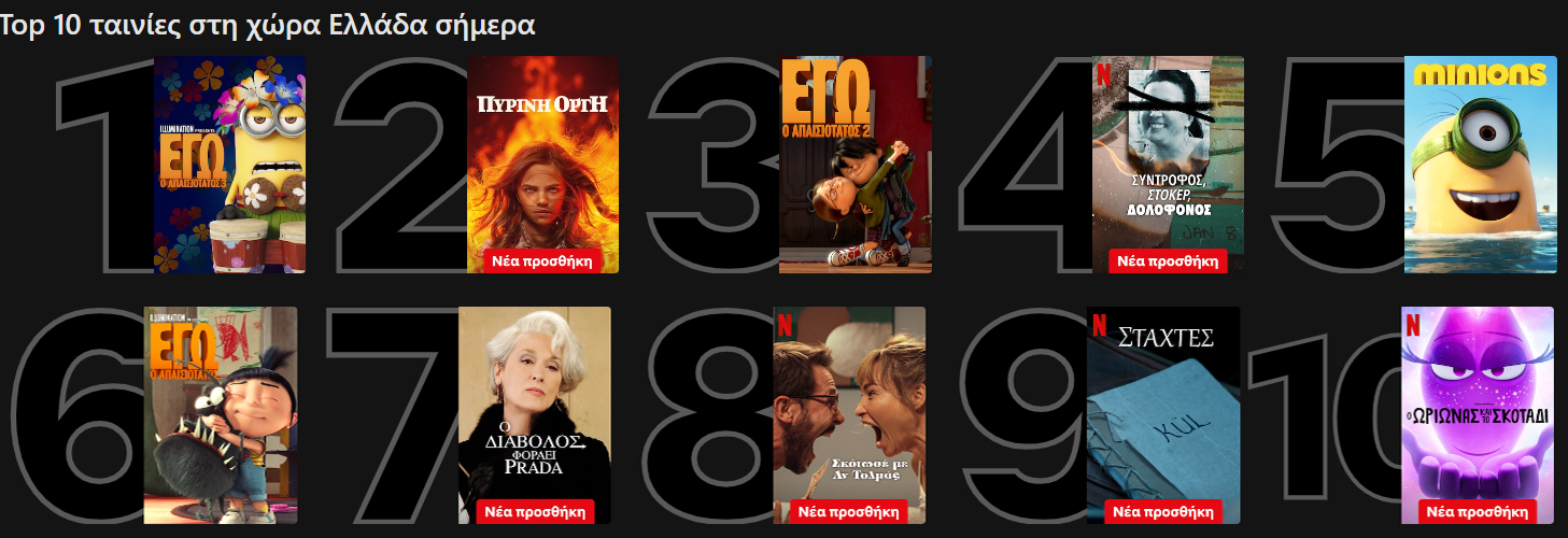 Αναφορικά με τις ταινίες, οι επιλογές του κοινού του ελληνικού Netflix έχουν καταφέρει να διαμορφώσουν ένα ιδιαίτερο Top 10 το οποίο ακροβατεί ανάμεσα στο «έγκλημα» και τα… κινούμενα σχέδια.