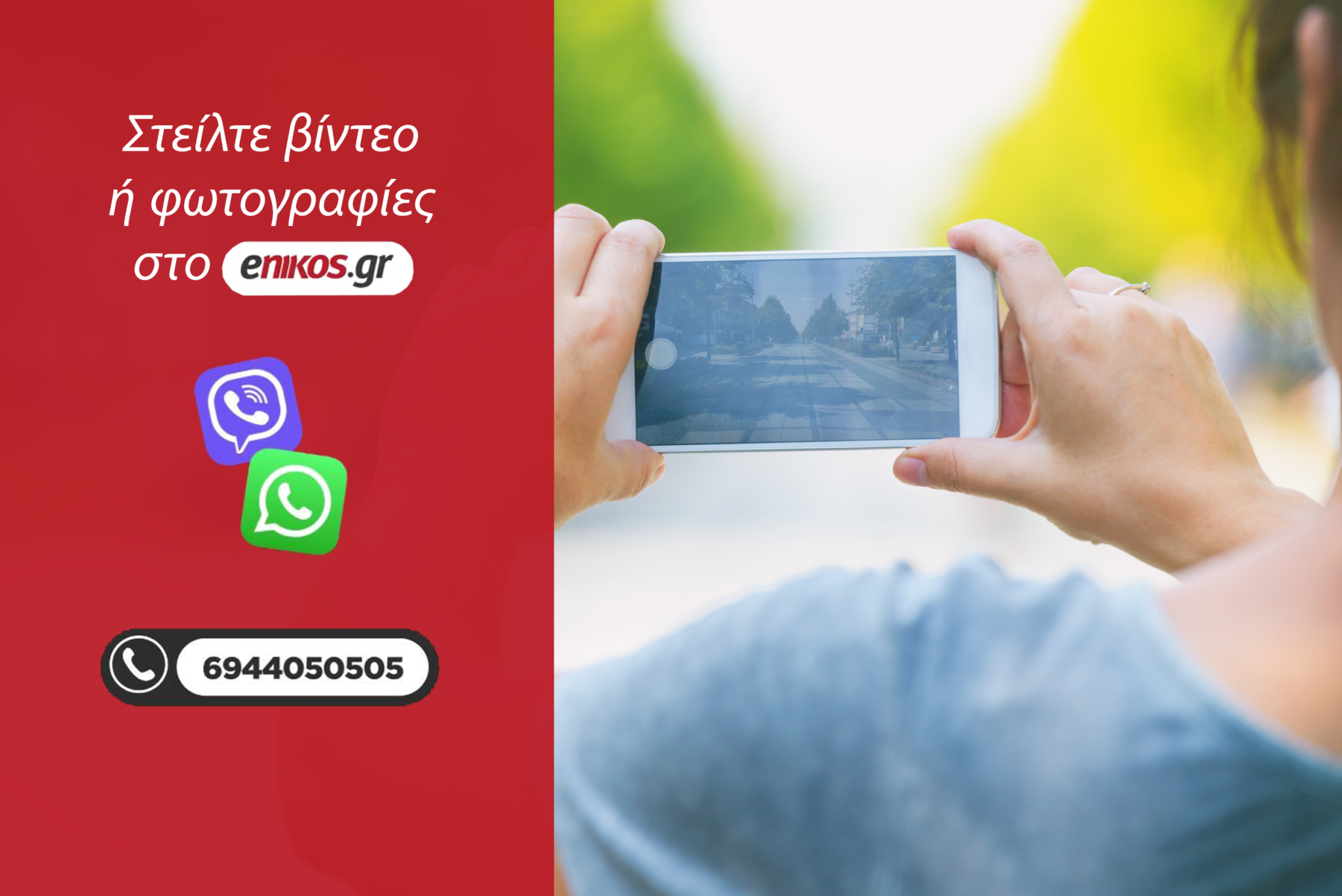 Αν θέλεις να στείλεις φωτογραφίες και βίντεο για να δημοσιευθούν στο enikos.gr ή να αναφέρεις κάποιο πρόβλημα που αντιμετωπίζεις στην περιοχή όπου βρίσκεσαι, αποθήκευσε στο κινητό σου τηλέφωνο τον αριθμό 6944 05 05 05 και στείλε τα δικά σου ντοκουμέντα μέσω Viber (χωρίς χρέωση) ή WhatsApp (χωρίς χρέωση).