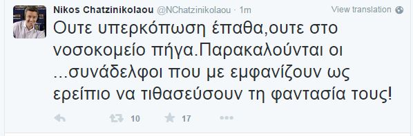Ο Νίκος Χατζηνικολάου έγραψε στο twitter: “Ούτε υπερκόπωση έπαθα, ούτε στο νοσοκομείο πήγα. Παρακαλούνται οι… συνάδελφοι που με εμφανίζουν ως ερείπιο να τιθασεύσουν τη φαντασία τους”.