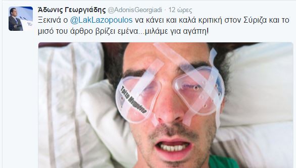 Συγκεκριμένα, ο Άδωνις Γεωργιάδης έγραψε: «Ξεκινά ο Λάκης Λαζόπουλος να κάνει και καλά κριτική στον ΣΥΡΙΖΑ και το μισό του άρθρο βρίζει εμένα… μιλάμε για αγάπη!»