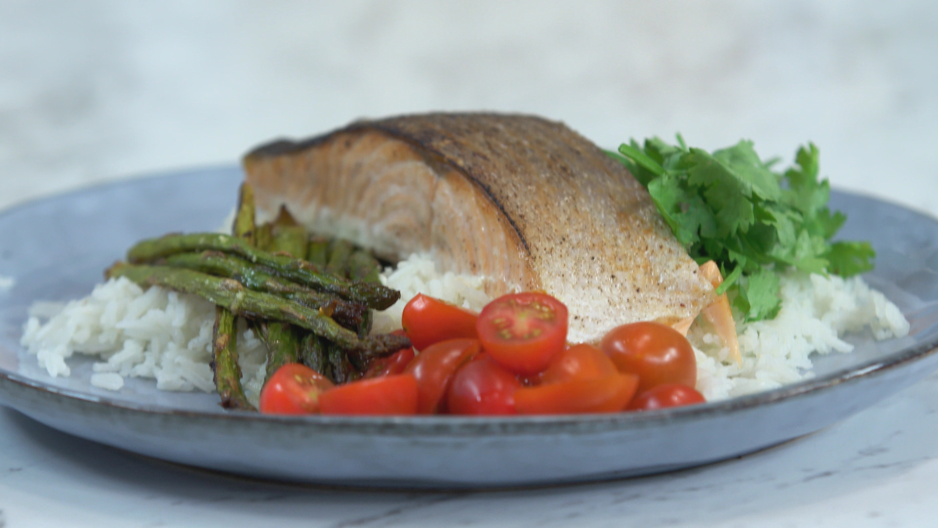 Για κυρίως γεύμα επιλέγει ένα πολύ αρωματικό και μεσογειακό φαγητό, σολομό με σπαράγγια στο φούρνο, ένα ντελικάτο πιάτο, που είναι στις must επιλογές όλων όσοι αναζητούν έναν υγιεινό τρόπο διατροφής. Σερβίρει με ρύζι, τα σπαράγγια, λάιμ, φρέσκο κόλιανδρο και ντοματίνια κομμένα στη μέση.