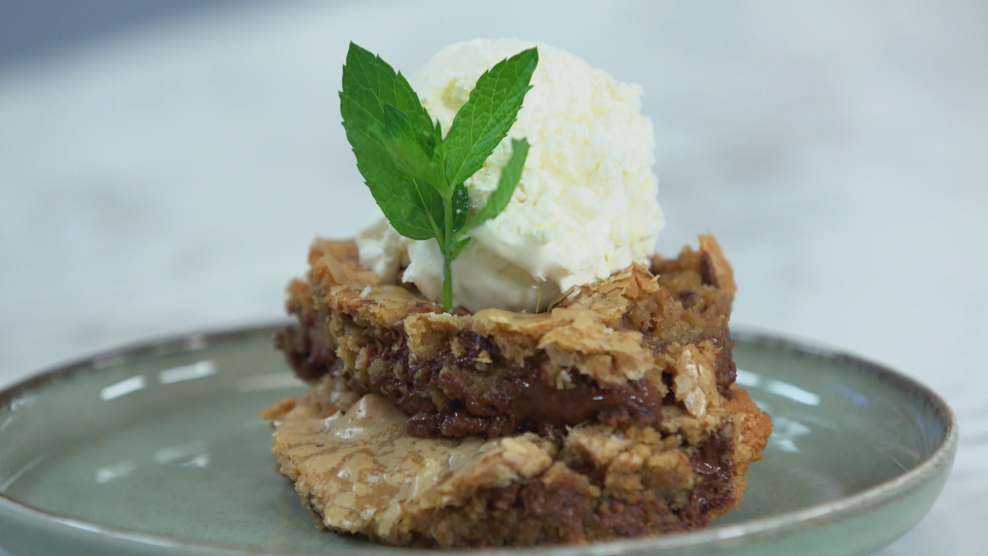 Για γλυκό, ο Άκης ετοιμάζει ένα soft cookie στο τηγάνι και σερβίρει με παγωτό και φύλλα δυόσμου.