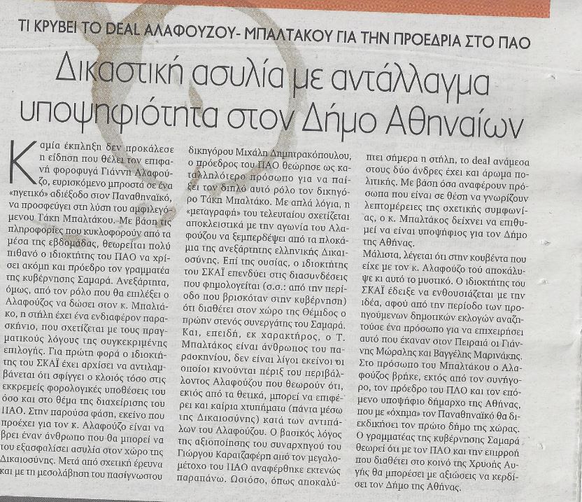 «Καμία έκπληξη δεν προκάλεσε η είδηση που θέλει τον εφοπλιστή φοροφυγά Γιάννη Αλαφούζο ευρισκόμενο μπροστά σε ένα “ηγετικό” αδιέξοδο στον Παναθηναϊκό, να προσφεύγει στη λύση του αμφιλεγόμενου Τάκη Μπαλτάκου. Με βάση τις πληροφορίες που κυκλοφορούν από τα μέσα της εβδομάδας, θεωρείται πολύ πιθανό ο ιδιοκτήτης του ΠΑΟ να χρίσει ακόμη και πρόεδρο τον γραμματέα της κυβέρνησης Σαμαρά. Ανεξάρτητα, όμως, από τον ρόλο που θα επιλέξει ο Αλαφούζος να δώσει στον κ. Μπαλτάκο, η στήλη έχει ένα ενδιαφέρον παρασκήνιο, που σχετίζεται με τους πραγματικούς λόγους της συγκεκριμένης επιλογής.