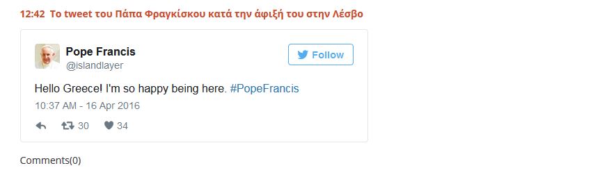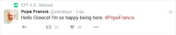 «Το tweet του Πάπα Φραγκίσκου κατά την άφιξή του στη Λέσβο», αναφέρει στη συνεχή ροή ειδήσεων της η ιστοσελίδα της ΕΡΤ στο διαδίκτυο, ενώ το συγκεκριμένο tweet το έχει αναδημοσιεύσει και στον λογαριασμό της στο Twitter.