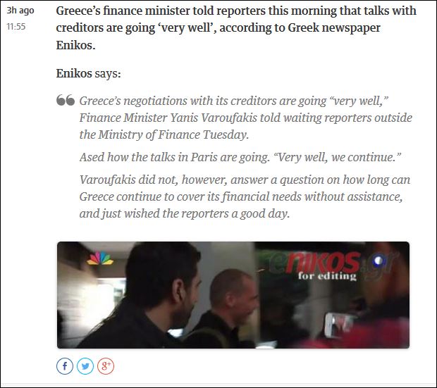 “Ο Έλληνας υπουργός Οικονομικών είπε στους δημοσιογράφους το πρωί ότι οι συζητήσεις με τους πιστωτές πηγαίνουν πολύ καλά, σύμφωνα με την ελληνική ιστοσελίδα Enikos”, γράφει ο Guardian στην ειδική στήλη για οικονομικά θέματα, όπου υπάρχει συνεχής ενημέρωση.