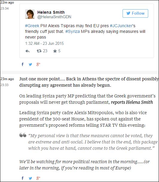 Στην ειδική στήλη που έχει η βρετανική εφημερίδα στην ιστοσελίδα της με live ενημέρωση για τις εξελίξεις, η ανταποκρίτρια της στην Αθήνα, Helena Smith γράφει μεταξύ άλλων: “Boυλευτής του ΣΥΡΙΖΑ προβλέπει ότι οι προτάσεις της Ελληνικής κυβέρνησης δεν θα περάσουν ποτέ απο τη βουλή”.