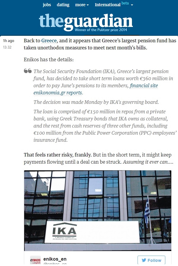 Σε αναδημοσίευση του ρεπορτάζ του enikonomia.gr με τίτλο «Σε repos αναζητά το ΙΚΑ 360 εκατ. ευρώ», προχώρησε σήμερα ο Guardian, στην ιστοσελίδα του. Το θέμα, δημοσιεύθηκε στην αγγλική έκδοση του enikos.gr, En.enikos.gr, από την οποία ο Guardian αλίευσε το θέμα και το δημοσίευσε ανάμεσα στα πρώτα και σημαντικότερα θέματα της ημέρας.