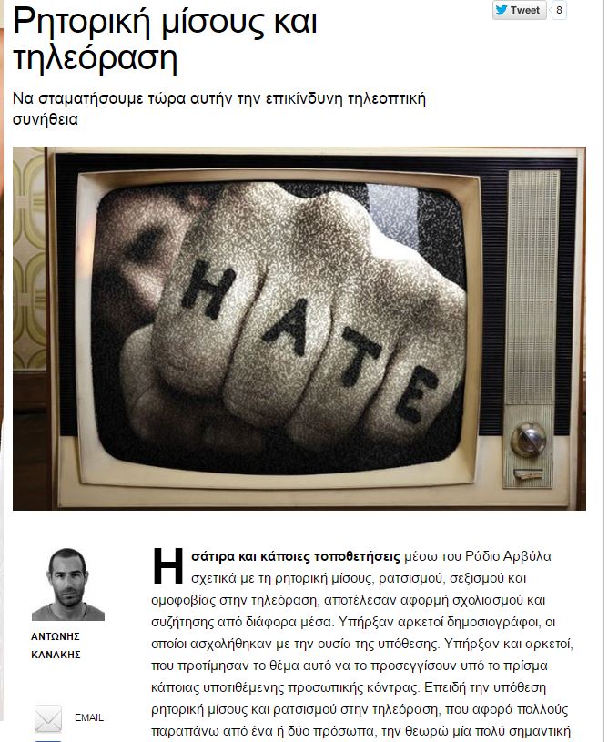 Η σάτιρα και κάποιες τοποθετήσεις μέσω του Ράδιο Αρβύλα σχετικά με τη ρητορική μίσους, ρατσισμού, σεξισμού και ομοφοβίας στην τηλεόραση, αποτέλεσαν αφορμή σχολιασμού και συζήτησης από διάφορα μέσα. Υπήρξαν αρκετοί δημοσιογράφοι, οι οποίοι ασχολήθηκαν με την ουσία της υπόθεσης. Υπήρξαν και αρκετοί, που προτίμησαν το θέμα αυτό να το προσεγγίσουν υπό το πρίσμα κάποιας υποτιθέμενης προσωπικής κόντρας. Επειδή την υπόθεση ρητορική μίσους και ρατσισμού στην τηλεόραση, που αφορά πολλούς παραπάνω από ένα ή δύο πρόσωπα, την θεωρώ μία πολύ σημαντική υπόθεση, πολύ σημαντικότερη από όλους μας και ιδιαίτερα επικίνδυνη για την κοινωνία, θα μου επιτρέψετε, στοχεύοντας πάντα την κατάσταση και όχι τα πρόσωπα, να εκφραστώ σχετικά.