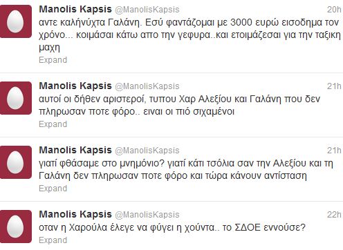 Μπροστά σε όλα αυτά, ο Μανώλης Καψής, αναγκάστηκε πριν από λίγο να αναρτήσει την απάντησή του σε ιστοσελίδα.Διαβάστε τι έγραψε:“Ok ας ξεκαθαρίσουμε τα πράγματα. Υπερασπίζομαι με πάθος τις απόψεις μου, και ορισμένες φορές- μεσ’ στα νεύρα μου- ναι, έχω παρεκτραπεί. Το ομολογώ και κάνω την αυτοκριτική μου. Θα ήθελα, μάλιστα- αν μου δινόταν η ευκαιρία- να ζητήσω και συγνώμη από ορισμένους ανθρώπους –όπως η Χαρούλα Αλεξίου και η Δήμητρα Γαλάνη- για τους οποίους ξεπέρασα το όριο.Υπερασπίζομαι με πάθος τις απόψεις μου και γι αυτό έχω υποστεί- και υφίσταμαι- χυδαίες επιθέσεις από συγκεκριμένους ανθρώπους και ιδεολογικούς χώρους, όπως και απειλές για την σωματική μου ακεραιότητα. Τι για χούντες έχω ακούσει- εγώ και πολλοί άλλοι που δεν ακολουθήσαμε το ρεύμα- τι για εντολές από αφεντικά, τι για εγκληματικές απόψεις για τις οποίες θα κληθούμε να λογοδοτήσουμε, τι για λαϊκά δικαστήρια και άλλα πολλά…Αλλά αυτό δεν δικαιολογεί να κάνω το ίδιο, να χρησιμοποιήσω την ίδια φρασεολογία, τις ίδιες μεθόδους, όσο κι αν είμαι θυμωμένος και αγανακτισμένος. Πιστεύω ότι όλοι έχουμε δικαίωμα να έχουμε τις απόψεις μας και να τις υπερασπιζόμαστε όπως θέλουμε. Πιστεύω ότι όλοι μας μπορούμε να ψηφίζουμε και να προπαγανδίζουμε για τον Σύριζα τη ΝΔ ή ακόμα και την Χρυσή Αυγή, χωρίς να δίνουμε λογαριασμό σε κανέναν. Γι αυτό και θέλω να κάνω την αυτοκριτική μου…Αφού είπα αυτά, να προσθέσω ότι θεωρώ έγκλημα την φοροδιαφυγή. Γιατί αυτά που δεν πληρώνουν είτε οι γιατροί είτε οι δικηγόρο είτε οι καλλιτέχνες… είναι τα χρήματα που λείπουν από το δημόσιο και αναγκάζεται η κυβέρνηση να κόβει τις συντάξεις. Όλοι αυτοί που δεν κόβουν αποδείξεις μας κλέβουν… και στην περίπτωση των καλλιτεχνών η ιστορία με τις εταιρίες είναι μια σκαστή υπόθεση φοροδιαφυγής.. Ούτε νόμιμο ούτε ηθικό. Απλά απαράδεκτο.Επίσης είναι πολύ ενοχλητικό- αυτή τη φορά προσέχω τις εκφράσεις μου- άνθρωποι που αποκαλύπτεται να κρύβουν τα εισοδήματα τους- και επιμένω ότι είναι αυτή ακριβώς η στάση παρά πολλών Ελλήνων που μας οδήγησε στην χρεοκοπία- να κουνάνε το χέρι στους υπολοίπους και να δίνουν μαθήματα. Και όταν, μάλιστα, αυτοί οι άνθρωποι επικαλούνται την Αριστερά, τότε είναι δυο φορές υποκριτές. Υποκριτές, όμως. Υποκριτές και φοροφυγάδες, όχι κάτι άλλο…”.