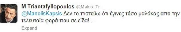 Τί να πω;”Χαρούλα Αλεξίου Από εκείνη τη στιγμή και μετά, ο Μανώλης Καψής δέχθηκε πολλά υβριστικά σχόλια στο twitter του, για τα όσα έγραψε για την αγαπημένη τραγουδίστρια.Τα μηνύματα είναι τόσα πολλά, που αν σας τα μεταφέραμε, θα χρειάζονταν πολλές σελίδες. Θα σας παραθέσουμε, όμως το μήνυμα που του έστειλε, μέσω twitter, ο Μάκης Τριανταφυλλόπουλος. ‘Εγραψε: