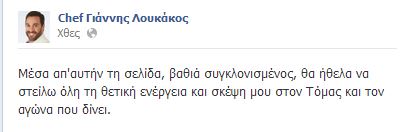 Ο σεφ Γιάννης Λουκάκος, μέσα από την προσωπική του σελίδα στο Facebook, έσπευσε να στείλει τις ευχές του στο νεαρό ηθοποιό Τόμας Πρωτόπαπα, που από την Κυριακή το πρωί δίνει μάχη για να κρατηθεί στη ζωή.