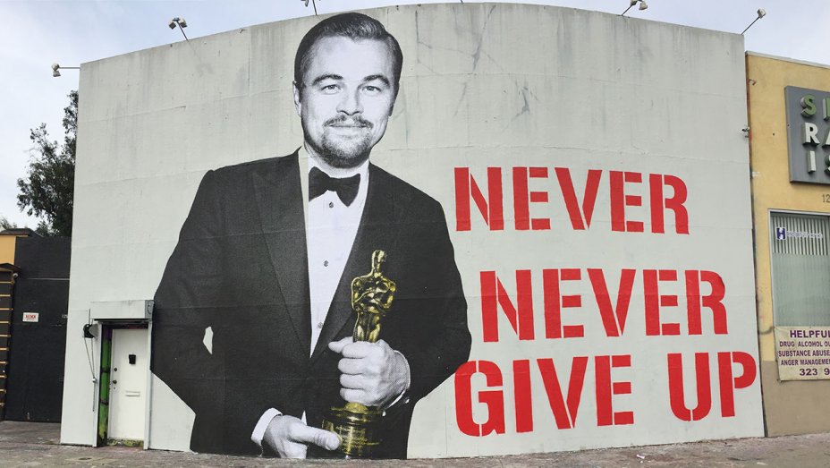 Και πως το γιόρτασαν; Με ένα τεράστιο graffiti στον τοίχο κτιρίου στο Λος Άντζελες, όπου ο διάσημος πρωταγωνιστής κρατά το βαρύτιμο Όσκαρ στα χέρια του και λέει τη φράση: «Ποτέ ποτέ μην τα παρατάς».