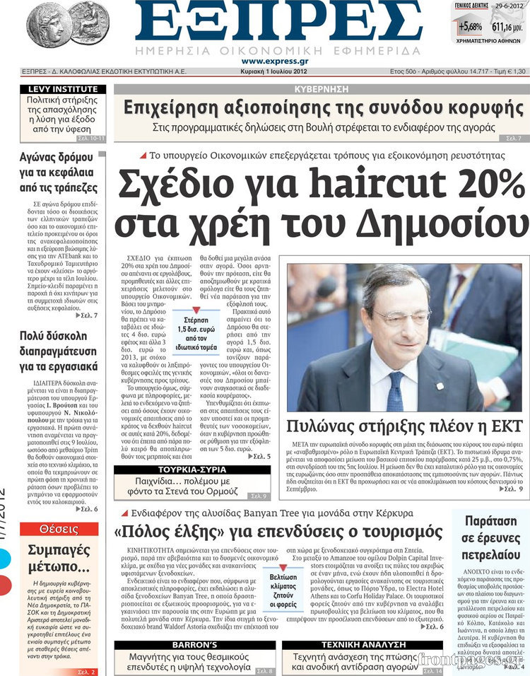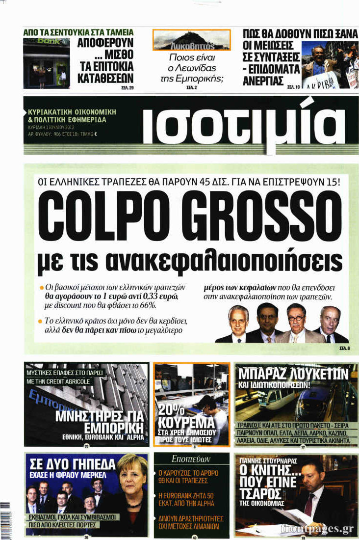 Ο οικονομικός Τύπος Enikos Newsroom 10:02, Κυριακή 01 Ιουλίου 2012 Media ΕΦΗΜΕΡΙΔΕΣ Μοιράσου το: σχολίασε κι εσύ (0 σχόλια) Ακολουθήστε το enikos.gr στο Google News και μάθετε πρώτοι όλες τις ειδήσεις Δείτε όλες τις τελευταίες ειδήσεις από την Ελλάδα και τον Κόσμο στο enikos.gr Ειδήσεις Ροή Ειδήσεων 5 ώρες πριν Χριστούγεννα στα μπλόκα: Επιμένουν στις κινητοποιήσεις τους οι αγρότες – Ανοίγουν τα διόδια το Σαββατοκύριακο 5 ώρες πριν Ουκρανία: Η άνευ προηγουμένου επίθεση σε ρωσικό τάνκερ στη Μεσόγειο και το μήνυμα προς στον Πούτιν – Το «μακρύ χέρι» του Κιέβου 4 ώρες πριν Πούτιν: Τα μηνύματα σε Ευρώπη και ΝΑΤΟ από το μαραθώνιο «σόου» του – Η απαίτηση για «σεβασμό» και η ειρήνη «με τους όρους» της Μόσχας 5 ώρες πριν Τραμπ: Δεν αποκλείει την πιθανότητα ενός πολέμου στη Βενεζουέλα – «Ο Μαδούρο ξέρει καλύτερα από τον καθένα τι ακριβώς θέλω» 6 ώρες πριν Συνεχίζει να προκαλεί ο Μίτσκοσκι: «Για μένα το όνομα Μακεδονία είναι ιερό» 4 ώρες πριν Ανακαλύφθηκαν αρχαία χρυσά νομίσματα 2.200 ετών που απεικονίζουν τον θεό Απόλλωνα – Η άγνωστη σύνδεση με τον Φίλιππο Β΄ της Μακεδονίας 5 ώρες πριν Ύπνος: Μια κρυφή κατάσταση του εγκεφάλου πριν από τον ύπνο μπορεί να είναι το “κλειδί” για υψηλή ευφυΐα και δημιουργικότητα 6 ώρες πριν Αριθμολογία: Οι άνθρωποι που έχουν γεννηθεί αυτές τις 4 ημερομηνίες, συχνά παρεξηγούνται – «Η καλοσύνη τους κρύβει τεράστια δύναμη» 7 ώρες πριν Ξεχάστε το καθάρισμα το Σαββατοκύριακο: Ο «κανόνας των 20 λεπτών» που θα σας λύσει τα χέρια 7 λεπτά πριν Η Ελλάδα προσχωρεί στη Διεθνή Επιτροπή Αποζημιώσεων για την Ουκρανία 22 λεπτά πριν GNTM: Η Ξένια Τσίρκοβα αναδείχθηκε μεγάλη νικήτρια και πήρε τις 50.000 ευρώ – Ποιος βρέθηκε σε απόσταση αναπνοής; 37 λεπτά πριν Θεσσαλονίκη: Εξαφανίστηκε 13χρονος από χώρο φιλοξενίας ασυνόδευτων ανηλίκων στο Ωραιόκαστρο 47 λεπτά πριν Ντόναλντ Τραμπ: «Πολύ βαριά αντίποινα» στη Συρία – «Πλήττουμε πολύ δυνατά οχυρά του Ισλαμικού Κράτους» 1 ώρα πριν Εξάρχεια: Ένταση με μολότοφ, χημικά και κρότου λάμψης ENIKOS NETWORK Το ΕΚΑΒ τιμήθηκε από την Ακαδημία Αθηνών για τα 40 χρόνια προσφοράς του Έχετε πραγματικά μεγάλη καρδιά; 10 χαρακτηριστικά όσων έχουν καλοσύνη Αναστολή μέτρων αναγκαστικής εκτέλεσης για κτηνοτρόφους που πλήττονται από την ευλογιά των αιγοπροβάτων Πλήρης επάρκεια προϊόντων στις λαϊκές της Αττικής, παρά τις αγροτικές κινητοποιήσεις – Τι απαντούν οι πωλητές Χαρτογραφώντας το «σημείο χωρίς επιστροφή»: Για πρώτη φορά αποκαλύπτεται με λεπτομέρεια το ακανθώδες όριο της ατμόσφαιρας τ... Η Google καταργεί τη λειτουργία «dark web report» – Πώς θα μπορούν οι χρήστες να διαγράφουν τα δεδομένα τους περισσότερα 02:50 , Σάββατο 20 Δεκεμβρίου 2025 GNTM: Η Ξένια Τσίρκοβα αναδείχθηκε μεγάλη νικήτρια και πήρε τις 50.000 ευρώ – Ποιος βρέθηκε σε απόσταση αναπνοής; Με φαντασμαγορικό τρόπο ολοκληρώθηκε το βράδυ της Παρασκευής ο μεγάλος τελικός του GNTM, μέσα ... 22:42 , Παρασκευή 19 Δεκεμβρίου 2025 Γιώργος Γιαννόπουλος για “Το σόι σου”: “Είναι ευτυχία και ευλογία αυτή η σειρά” «Είναι ευτυχία και ευλογία η συγκυρία αυτής της σειράς», θα πει ο Γιώργος Γιαννόπουλος -ο αγαπ... 20:37 , Παρασκευή 19 Δεκεμβρίου 2025 Don’t Forget The Lyrics: Η Έλλη Κοκκίνου υποδέχεται 4 παίκτες που θα κάνουν τα πάντα για να μη χάσουν ούτε… μισή λέξη από τους στίχους Το «Don’t Forget The Lyrics» επιστρέφει απόψε, Παρασκευή 19 Δεκεμβρίου, στις 21:00 με νέο επει... 19:31 , Παρασκευή 19 Δεκεμβρίου 2025 GNTM: Απόψε ο μεγάλος τελικός για τους 4 φιναλίστ Έπειτα 
