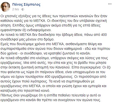 «Οι χτεσινές εξελίξεις για τις άδειες των τηλεοπτικών καναλιών δεν ήταν καθόλου καλές για το ΜΕΓΚΑ. Οι ιδιοκτήτες του δεν υπέβαλαν σχετική αίτηση. Ελπίδες όμως υπάρχουν ακόμα επειδή για τις επτά άδειες εμφανίστηκαν έξι ενδιαφερόμενοι. Αν τελικά το ΜΕΓΚΑ δεν διεκδικήσει την έβδομη άδεια, πάνω από 400 συνάδελφοί μας μένουν στο δρόμο. Εμείς που δουλέψαμε χρόνια στο ΜΕΓΚΑ, αισθανόμαστε θλίψη και συμπαριστάμεθα στον αγώνα που δίνουν καθημερινά – εδώ και περίπου δύο χρόνια – οι συνάδελφοι, να κρατηθεί ζωντανό το κανάλι.