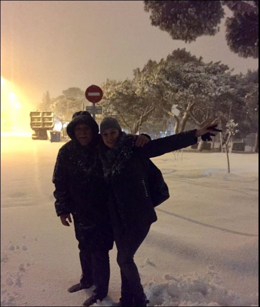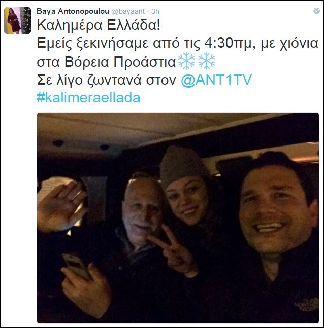 Η παρουσιάστρια συνόδεψε τις φωτογραφίες που ανέβασε στον προσωπικό της λογαριασμό στο twitter, με τους τίτλους: «Το #kalimeraellada δεν το σκιάζει ο χιονιάς!Σε λίγο μαζί.Εμείς ξεκινήσαμε από τις 4:30πμ, με χιόνια στα Βόρεια Προάστια».