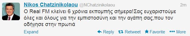 “O Real FM κλείνει 6 χρόνια εκπομπής σήμερα! Σας ευχαριστούμε όλες και όλους για την εμπιστοσύνη και την αγάπη σας, που τον οδήγησε στην πρωτιά”, έγραψε χαρακτηριστικά ο Ν. Χατζηνικολάου, στον προσωπικό του λογαριασμό στο twitter.
