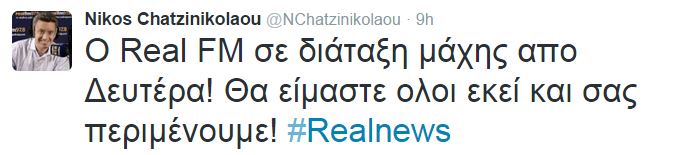 “Ο Real FM σε διάταξη μάχης απο Δευτέρα! Θα είμαστε όλοι εκεί και σας περιμένουμε” έγραψε στο Twitter o Νίκος Χατζηνικολάου.